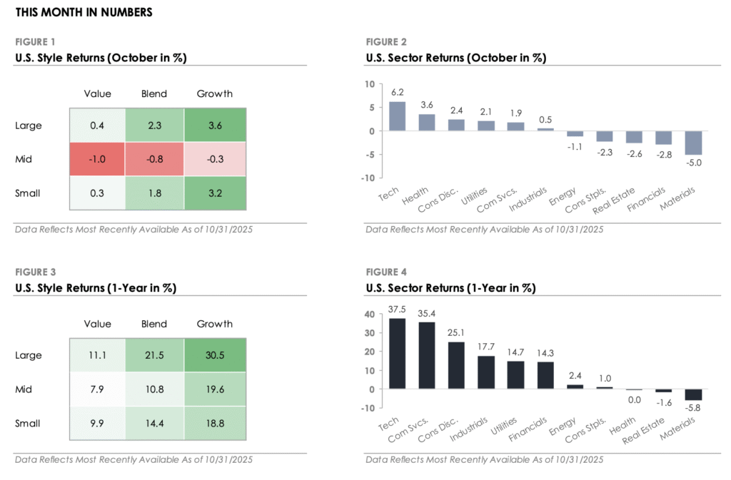 - The S&P 500 Index rose +2.3% in October, bringing its year-to-date return to +17.5%. Large Cap Growth stocks gained +3.6% and outperformed the index, while Large Cap Value returned +0.4%. Major stock indices set new highs, with the S&P 500, Dow Jones, Nasdaq 100, and Russell 2000 all posting a sixth straight month of gains.