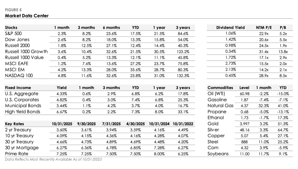 Stocks ended October near all-time highs after they staged a late-month recovery. Credit concerns surfaced early in the month after multiple regional banks disclosed losses tied to commercial real estate fraud. The news came only weeks after two high-profile bankruptcies in the auto sector and reignited concerns about credit quality. Stocks initially sold off, but by month-end, concerns eased as credit rating agencies and analysts characterized the issues as isolated rather than systemic.