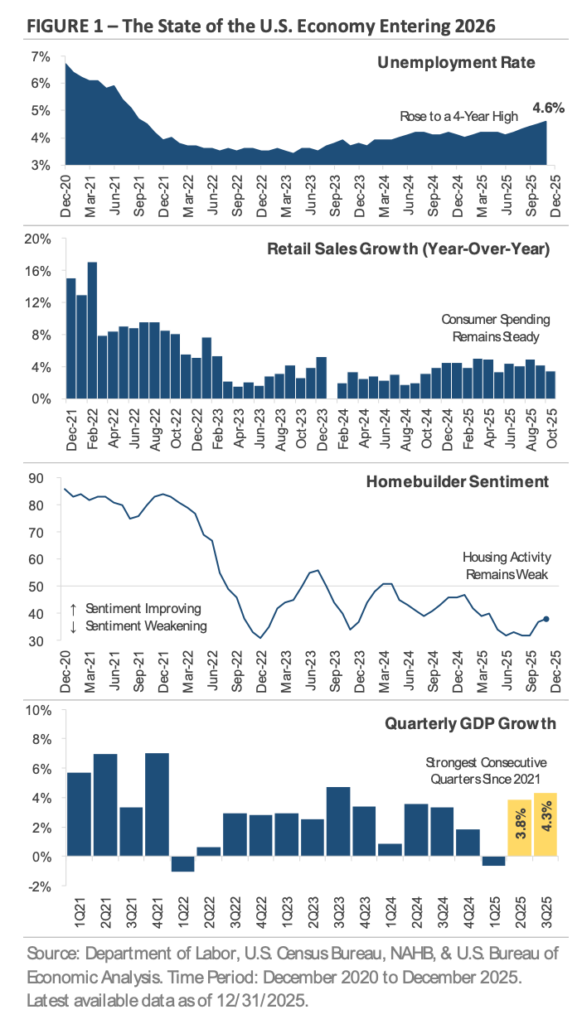 Figure 1 summarizes what the newly released data tells us about the economy. The first chart shows that the job market cooled during Q4, with hiring slowing and unemployment rising to its highest level in four years. The second chart focuses on consumer spending, which has eased since its post-pandemic surge but remains steady. Despite higher prices and affordability challenges, consumers have continued to spend, helping support economic growth. The third chart looks at housing, using a measure of homebuilder confidence. While confidence has improved slightly, it remains below levels that typically signal a healthy housing market, indicating that housing activity is still below pre-pandemic norms. The final chart shows economic growth rose to 4.3% in the third quarter, up from 3.8% in the prior quarter—the strongest back-to-back growth since 2021.