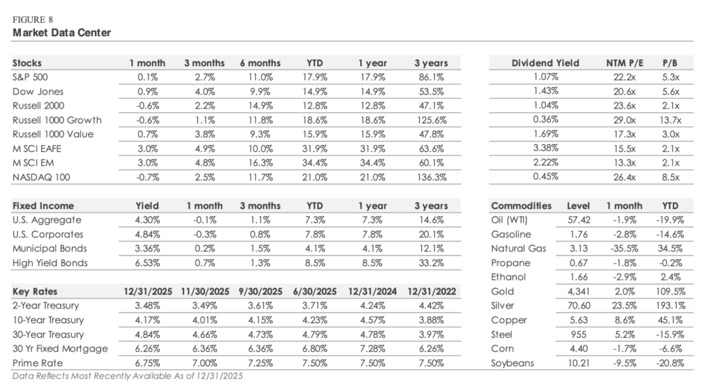 Outside the U.S., international stock markets continued to outperform. Stocks in both developed and emerging markets posted strong gains in Q4 and significantly outpaced U.S. stocks for the year. This strength was not due to weakness in the U.S. market, which still posted solid returns, but rather broad improvement overseas. A weaker U.S. dollar also played a role, helping international investments and reflecting ongoing trade tensions, policy uncertainty, and a shift in investor interest toward opportunities outside the United States.