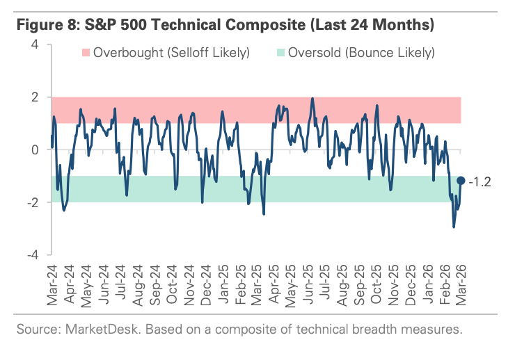 And here’s one more encouraging data point worth noting: the MarketDesk Technical Composite — a composite measure of market breadth — is currently sitting at -1.2, squarely in “oversold” territory. Historically, readings at this level have been associated with a higher probability of a near-term bounce, not a deeper collapse. The market has been pushed down hard enough that a rebound is more likely than not from a purely technical standpoint.
